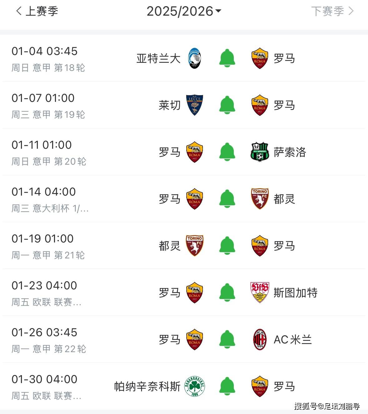 最让罗马球迷担忧的是,罗马在整个一月份有包括意甲联赛、欧联杯、和意大利杯三线场比赛,几乎是每隔三天都要踢上一场,1月4日,罗马客场挑战亚特兰大,不到两天就要奔赴莱切客场对阵莱切,三天后回到主场对阵萨索洛,又一个三天意大利杯在主场对阵都灵,四天后意甲赛场依然是对阵都灵,再过三天罗马在主场对阵现在的领头羊AC米兰,又一个三天客场欧联杯对抗帕纳辛纳科斯。可以说,2026年整个一月罗马压根是马不停蹄,根本没有任何喘息的时间。
