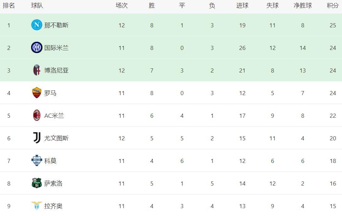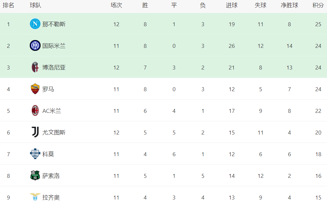 在积分榜上,那不勒斯凭借这场胜利登上了榜首,积25分,战绩为8胜1平3负。然而,他们的榜首位置并不稳固,因为国际米兰、博洛尼亚和罗马分别只落后1分,而国际米兰和罗马还少踢1场比赛。AC米兰积22分,排名第4,尤文图斯以20分位列第5。本赛季的冠军争夺异常激烈,尤文图斯与榜首的差距仅为5分。返回搜狐,查看更多