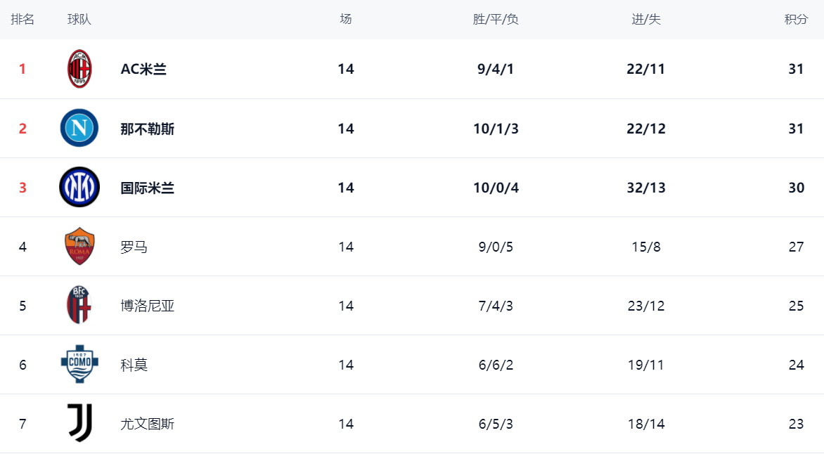 在积分榜上,前2的积分相同。AC米兰总积分31分,以净胜球的优势,登上榜首位置。而同样31分的那不勒斯只能屈居第2。国际米兰以30分排名第3。第4的是罗马,只拿到27分,与榜首有4分的差距。博洛尼亚25分排名第5。第6的是科莫,拿到24分。尤文图斯只拿到23分,排名第7。拉齐奥和亚特兰大的战绩都很差。拉齐奥19分排名第10,而亚特兰大只有16分排名第12。返回搜狐,查看更多