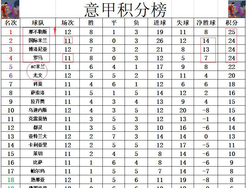 积分榜方面,凭借本场胜利,那不勒斯暂时积24分,领先国米和罗马1分,重回榜首位置。博洛尼亚豪取三连胜,紧随其后紧追国米与罗马,凭借净胜球优势排名第三。尤文图斯则因客场战平,无力缩小与AC米兰的积分差距,目前位列第六,落后AC米兰2分。