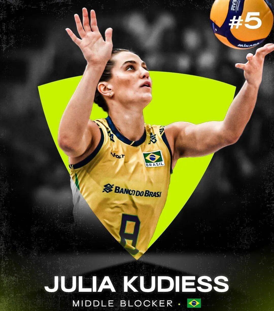 第五名:朱莉娅·库迪斯(Julia Kudiess),才22岁,就已经是2025年全球最厉害的副攻之一了。她在VNL和世锦赛上都拿了最佳拦网奖,在巴西超级联赛里也是表现最稳定的,排在第一。而且她的快攻起跳速度快、动作流畅,进攻效率特别高,是年轻球员里的佼佼者,可以说是未来十年巴西女排的重要核心人物之一。