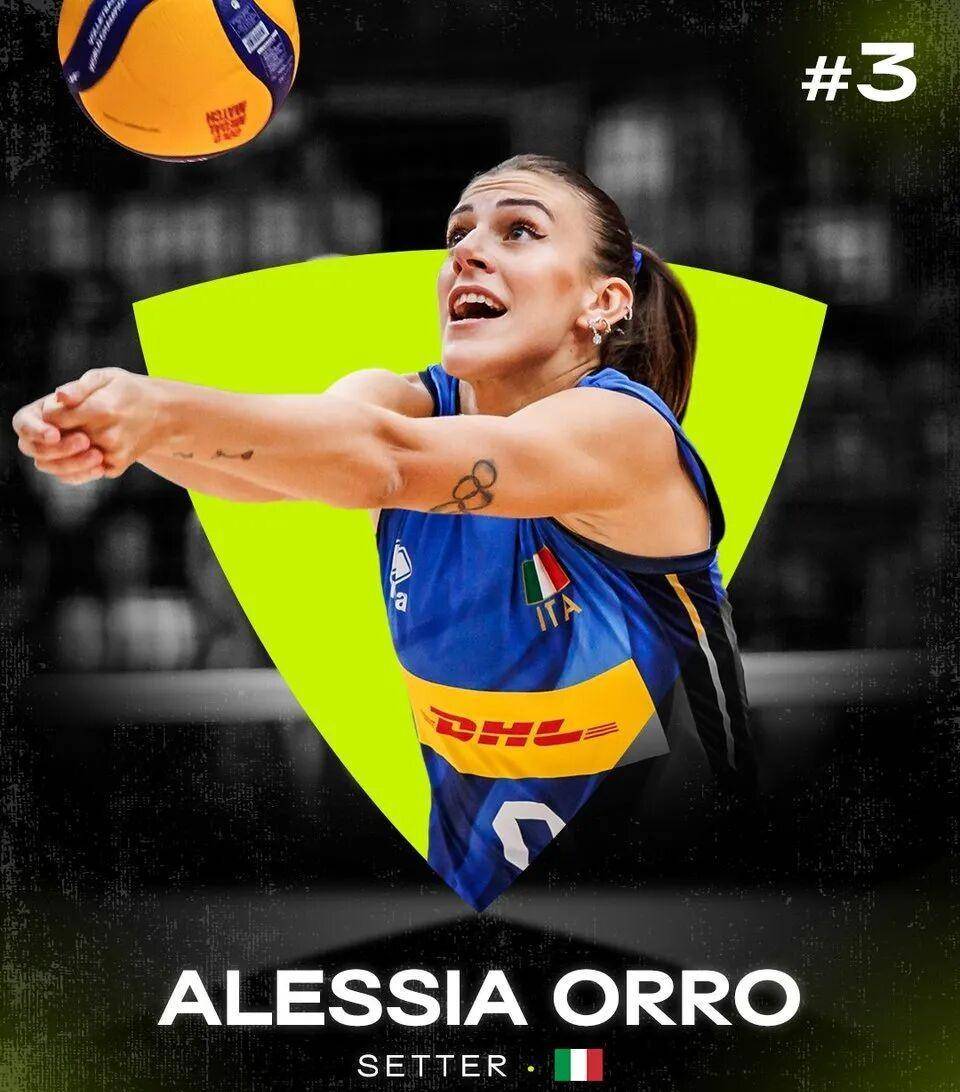 第三名是阿莱西娅·奥罗(Alessia Orro),她是意大利女排的二传核心。在2025年,奥罗表现得非常出色,不仅带领队伍拿下了两个冠军——世界联赛和世锦赛,还被评选为世锦赛的MVP。她的节奏把控、传球视野和心理素质都非常棒,几乎可以说是完美的结合。她真正做到了“用脑子打球”,是意大利队里的关键人物,也是大家心目中的灵魂球员。