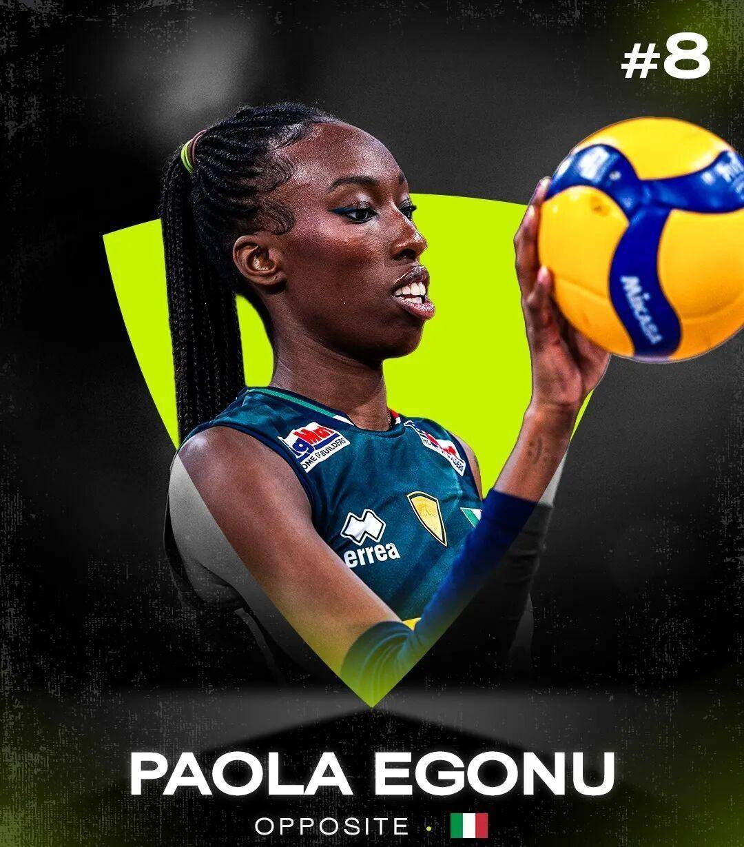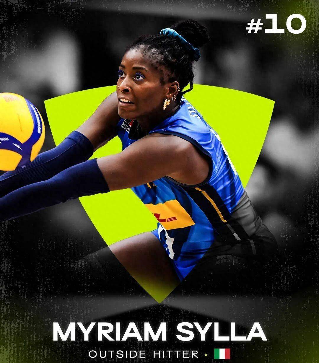 第十名是米里亚姆·塞拉(Myriam Sylla)。每当比赛到了最关键的时候,她总能站出来扛起球队。她在2025年的国家联赛中作为主攻入选了“最佳阵容”,之后又随意大利队拿到了世界锦标赛的冠军,继续书写着意大利女排的辉煌。她性格强硬、激情四射,既有丰富的经验,又有十足的冲劲,是意大利队不可或缺的核心人物,也是俱乐部里值得信赖的主力。