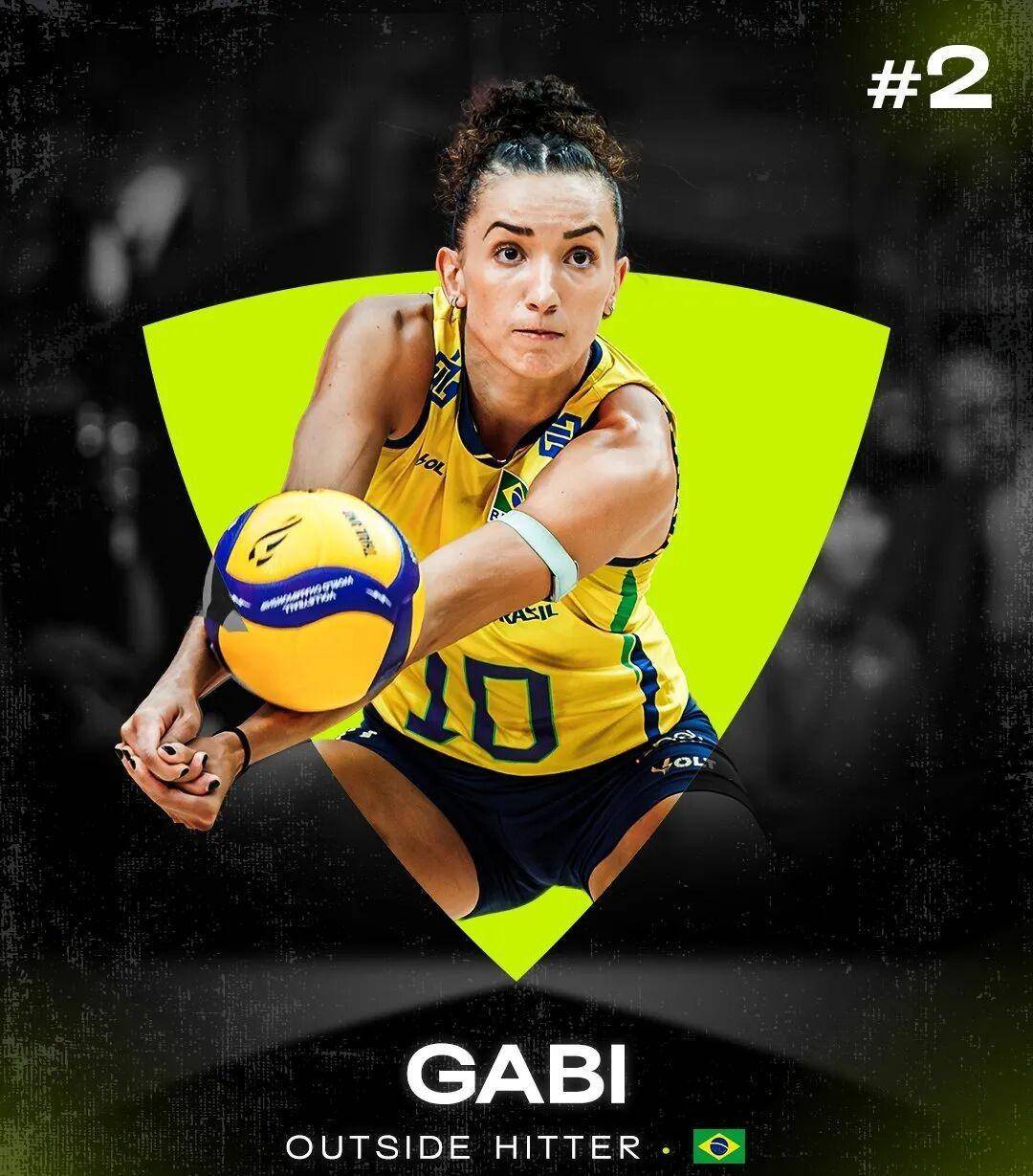 第二名是加比(Gabi)。不管是俱乐部还是国家队,2025年的加比一直都站在领奖台上。她跟着科内利亚诺女排拿到了意甲冠军,还在总决赛中拿了MVP。在国家队这边,她两场分别砍下64分,帮助巴西打进了世锦赛四强。她是队伍的核心,攻防两端都特别关键,也是全场最受关注的焦点人物。