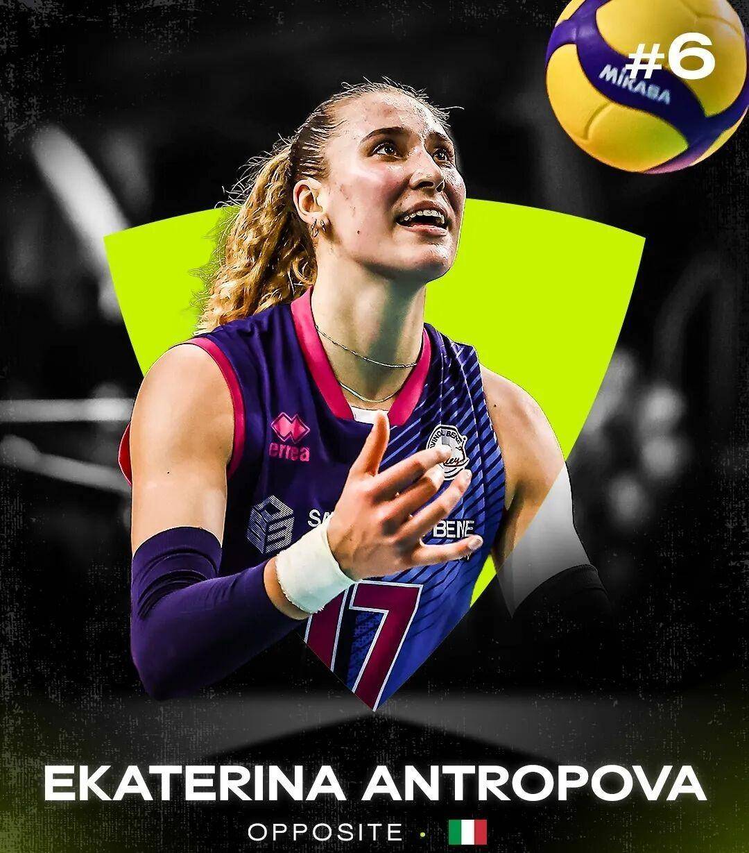 第六名:叶卡捷琳娜·安特罗波娃(Ekaterina Antropova),2025年对她来说简直是高光时刻。这一年,她在国家队的两大重要赛事——VNL和世锦赛上都表现得非常出色,帮助意大利女排稳稳地站在了世界顶级强队的位置上。更让人惊讶的是,她在俱乐部斯坎迪奇女排的表现也非常抢眼,带领球队一路过关斩将,拿下了队史上的首个女排世俱杯冠军,而且决赛中还击败了实力强劲的科内利亚诺队。
