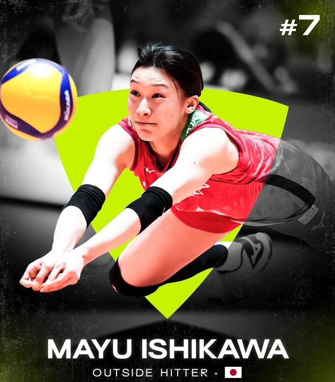 第7名是石川真佑(Mayu Ishikawa)。2025年对她来说是个“第一次”的年份——第一次加盟意大利的诺瓦拉俱乐部,第一次担任日本女排国家队队长。她迅速成为诺瓦拉队的主力主攻,带领球队打进了联赛前四;在国家队,她凭借全面的技术,拿下了世锦赛的最佳主攻称号。不管是接发球、一传、防守还是发球,她都扛得起大旗,真正展现了什么叫“全能主攻”的实力。